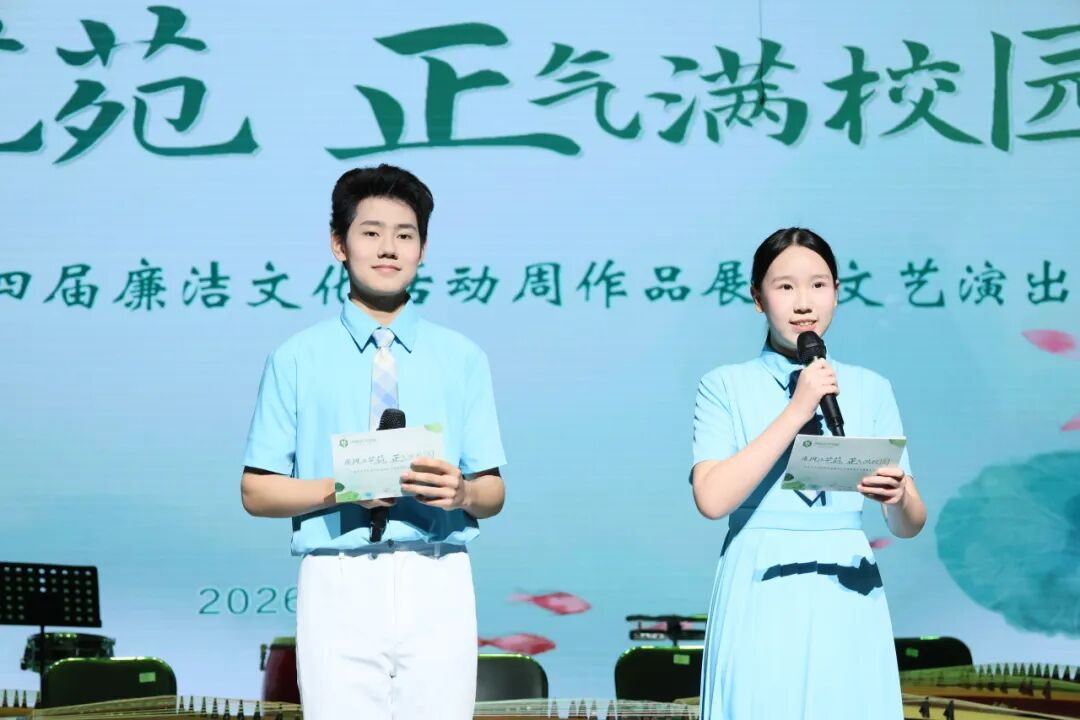 本次活动以“廉风沐艺苑 正气满校园”为主题,分艺术作品展与文艺演出两大板块,作品展与演出紧扣廉洁主题,充分凸显艺校专业优势,将廉洁理念与艺术实践深度融合,让崇廉尚洁的正能量浸润人心。活动伊始,副校长夏文发表讲话。她指出,此次活动既是深化“艺小莲”廉洁文化品牌、践行“弘毅”校训的重要举措,也是落实教育系统清廉建设要求、培育风清气正校园生态的具体行动。讲话中,她引用古人诗句诠释廉洁修身真谛,回顾学校廉洁教育成果,并明确下一步将从深化宣传教育、推动廉洁融入课程、健全制度保障等多方面发力,持续推进清廉学校建设提质增效,同时向全体师生发出崇廉尚洁的倡议。