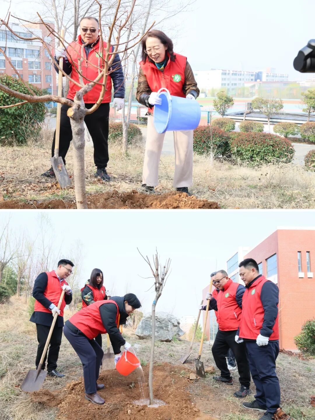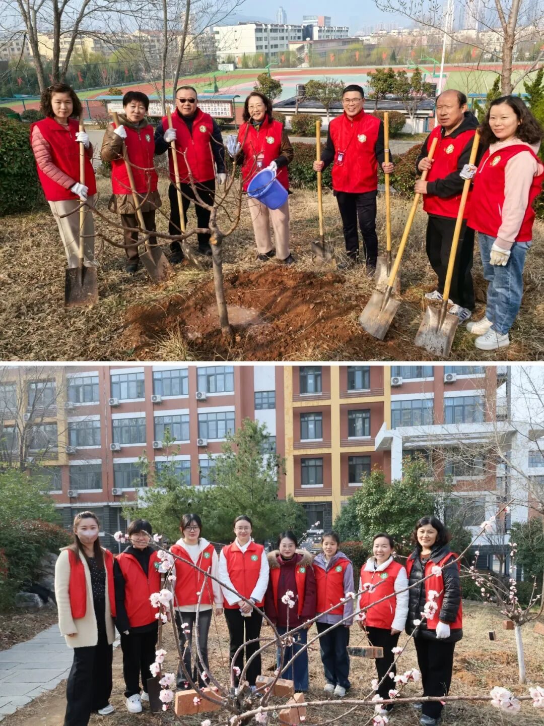 植树现场秩序井然、氛围热烈。活动中,党员教师们热情高涨、配合默契,将“十年树木,百年树人”的教育理念悄然融入劳动的每一个环节。本次植树活动中,学校特意栽种杏树与柿树。以杏树致敬杏坛耕耘、诲人不倦的师者精神,以柿树祈愿同学们勤学笃行、学业丰收,在成长路上结出丰硕果实。