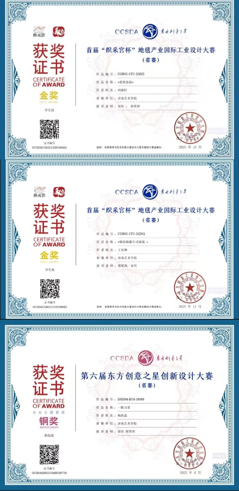 在2025年东方创意之星设计大赛系列赛事中,我校学子收获颇丰。首届“织采宫杯”地毯产业国际工业设计大赛里,2024级数媒班刘睿轩、王佳琳两位同学凭借严谨的设计方案,荣获省赛金奖;第六届东方创意之星创新设计大赛中,杨欣蕊同学获得省赛铜奖。