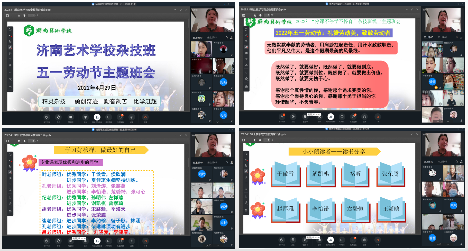 “小喜鹊造新房,小蜜蜂采蜜糖,幸福的生活从哪里来,要靠劳动来创造......”伴随着《劳动最光荣》的歌声,济南艺术学校杂技班召开了2022年五一劳动节主题班会。班主任杨秀琴老师鼓励同学们积极参加五一劳动节主题活动,在居家学习和训练期间,不忘劳动的优良传统,热爱劳动,珍惜劳动成果。