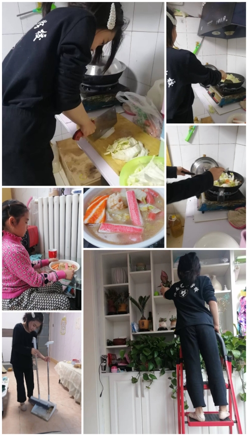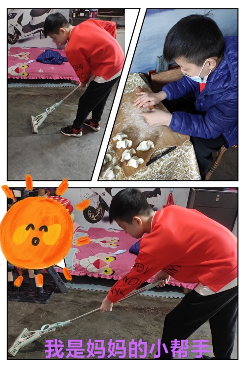 瞧,同学们包的水饺真好看,做的饭菜色香味俱全,还把家里打扫得干干净净!褚昕同学拿起针线包,用旧衣服做了一个棉垫子用来练功;解凯棋同学最近爱上了朗诵,和妈妈一起诵读赞扬劳动者的诗歌。