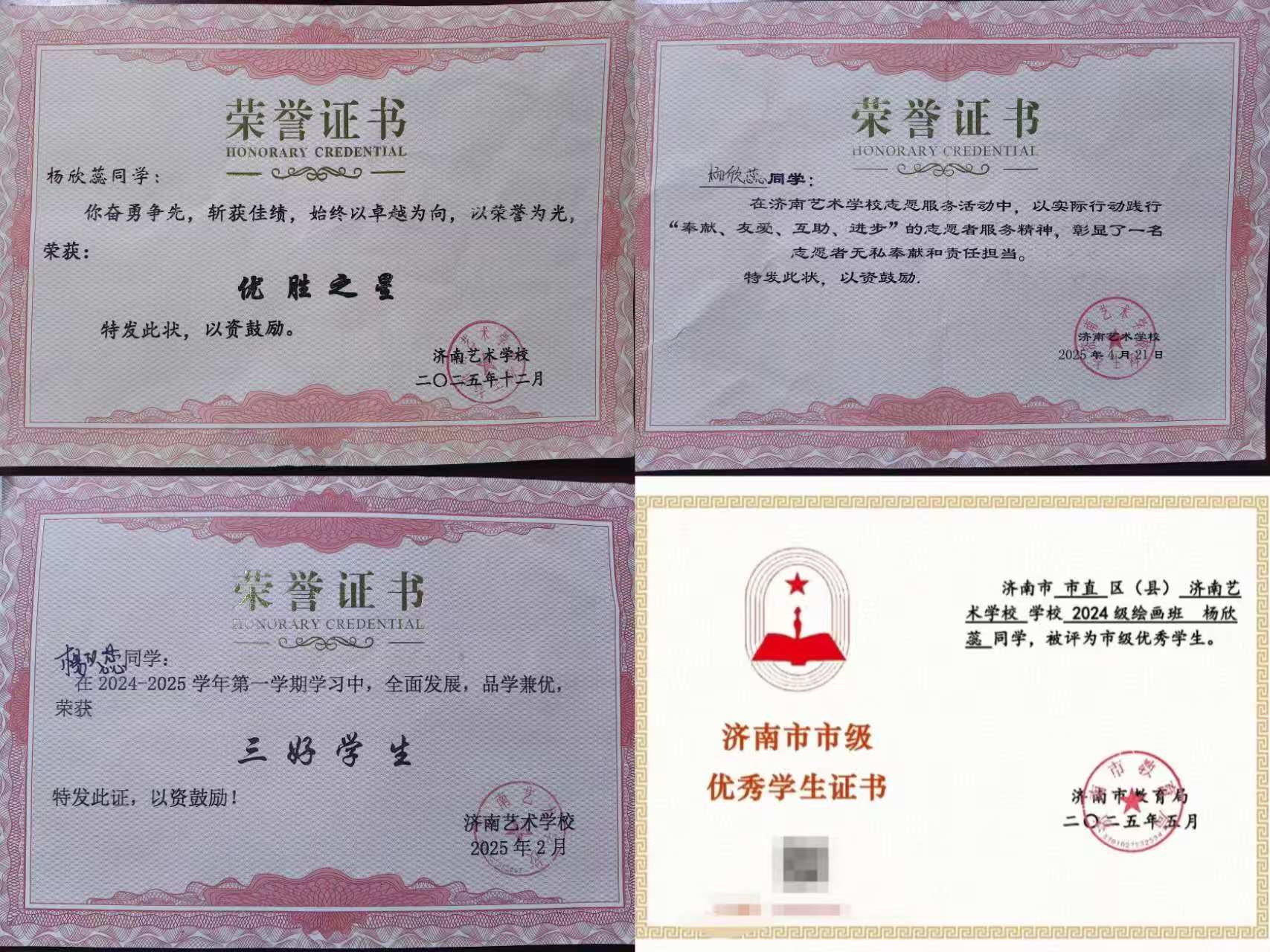 课堂上的杨欣蕊,总能保持饱满的学习热情。她认真对待每一堂课、每一次作业,主动参与课堂讨论和项目展示,还将志愿服务中养成的责任担当融入日常学习的点滴之中。面对考试与专业任务,她从不懈怠,始终以积极姿态从容应对,成绩始终稳居班级前列。凭借品学兼优、全面发展的优异表现,她两次获评“三好学生”,更斩获济南市优秀学生和学校“优秀之星”荣誉称号。她不仅成为同学们争相学习的榜样,也成了老师身边靠谱的得力助手。