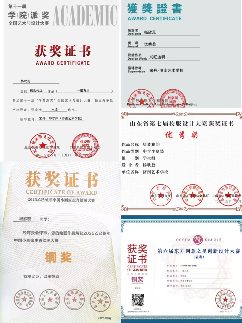 从校园课堂到艺术赛场,每一份成绩的背后,都是日复一日的默默坚持。为打磨参赛作品,她曾连续多日潜心钻研,端坐电脑前反复推敲——从构思草图、细化线条到上色调整、优化细节,每个环节都精益求精。遇到创作瓶颈时,她从不气馁,主动向专业老师请教,与同学们共同探讨解决方案。在近两个月的比赛集训中,她对自己严格要求,与团队成员默契协作,最终在“2025年第十八届山东省职业院校技能大赛(中职组)”中斩获三等奖,在“第六届东方创意之星创新设计大赛(山东省)”中荣获铜奖。这些成绩的取得,既离不开她自身的刻苦努力,更得益于学校提供的优质资源:丰富的艺术课程、专业的师资力量与多元的实践平台,为她的艺术成长筑牢了坚实根基。