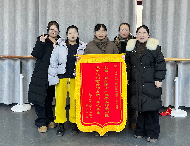 这面锦旗,不仅是家长对21舞蹈小2班教师团队分工协作、全面育人成果的高度认可,更是济南艺术学校教学团队与德育团队协同育人、匠心育才的生动缩影。二者同向发力、同频共振,构建起“全员育人、全程育人、全方位育人”的坚实体系,让每个孩子都能在德艺兼修的道路上稳步前行。未来,济南艺术学校全体教师将继续怀揣教育初心,坚守育人使命,以更紧密的团队协作、更专业的教学素养,不负家长的信任与重托,用爱心与坚守呵护每一个孩子的艺术梦想,让温暖与希望在校园中持续传递,让每一位艺校少年都能在追梦路上绽放更耀眼的光芒!(供稿:政教处 初审:徐晓平 复审:任莉伟 终审:国成彪 编审:靳丽 校对:潘玉虹 核发:国成彪)